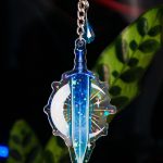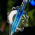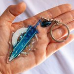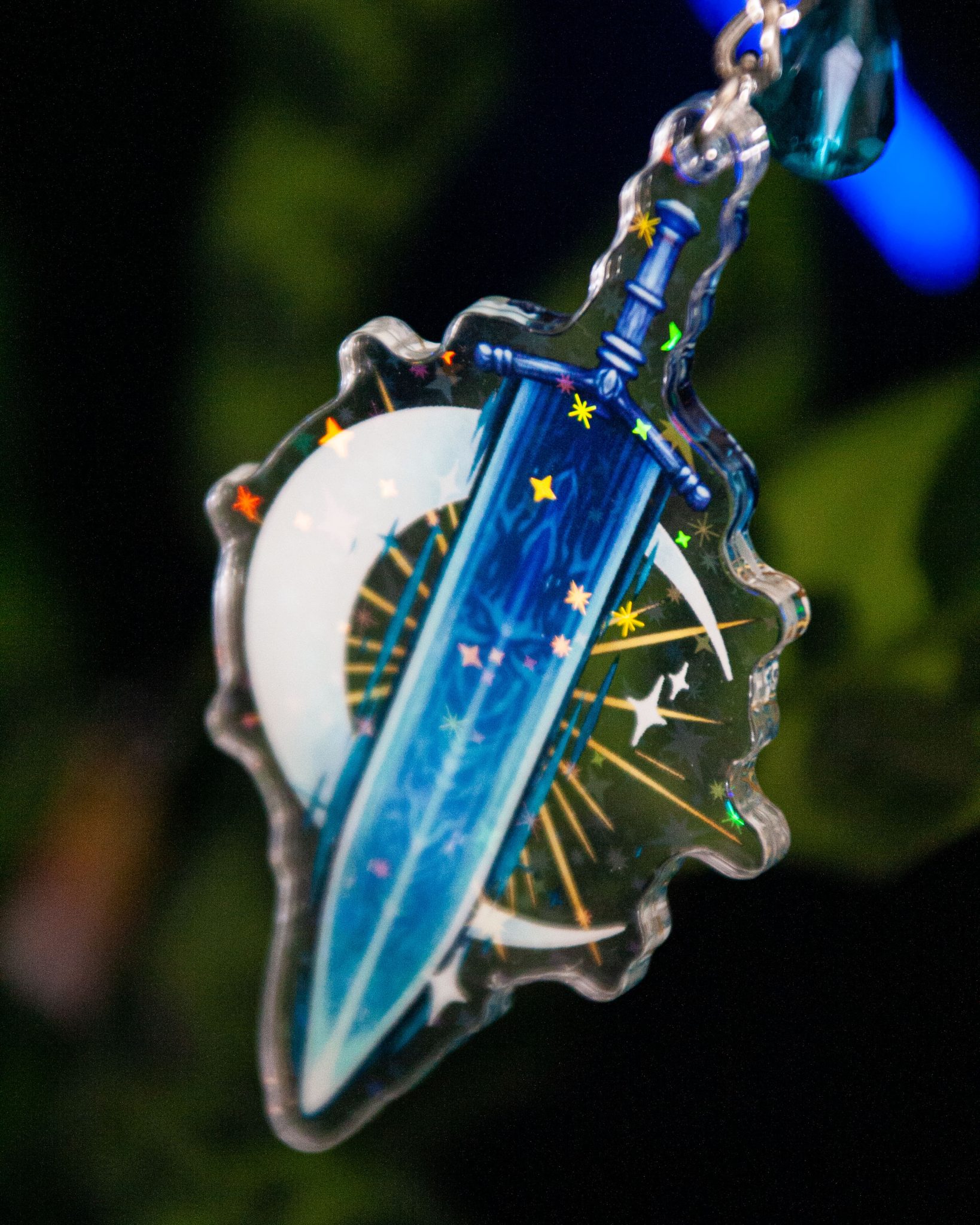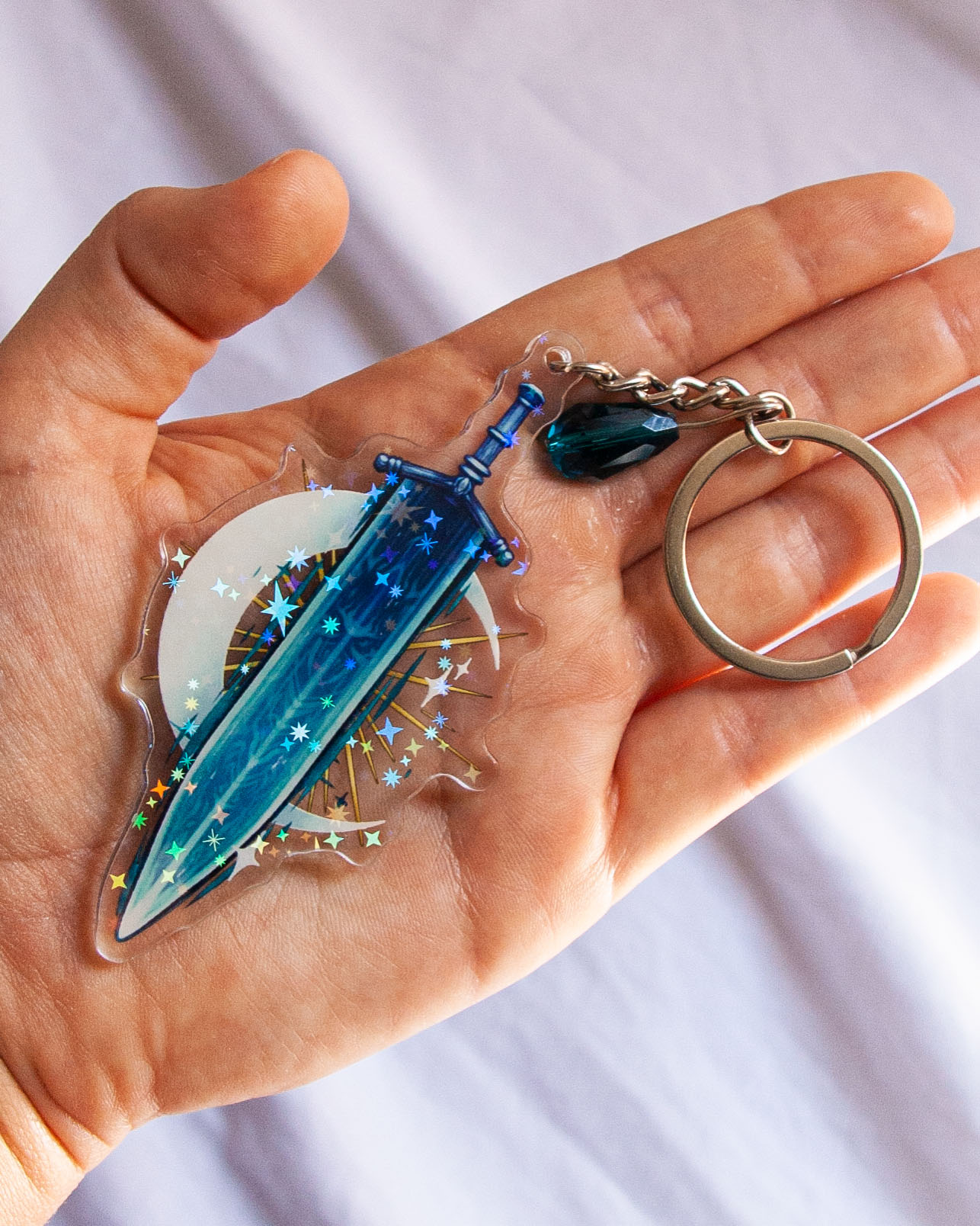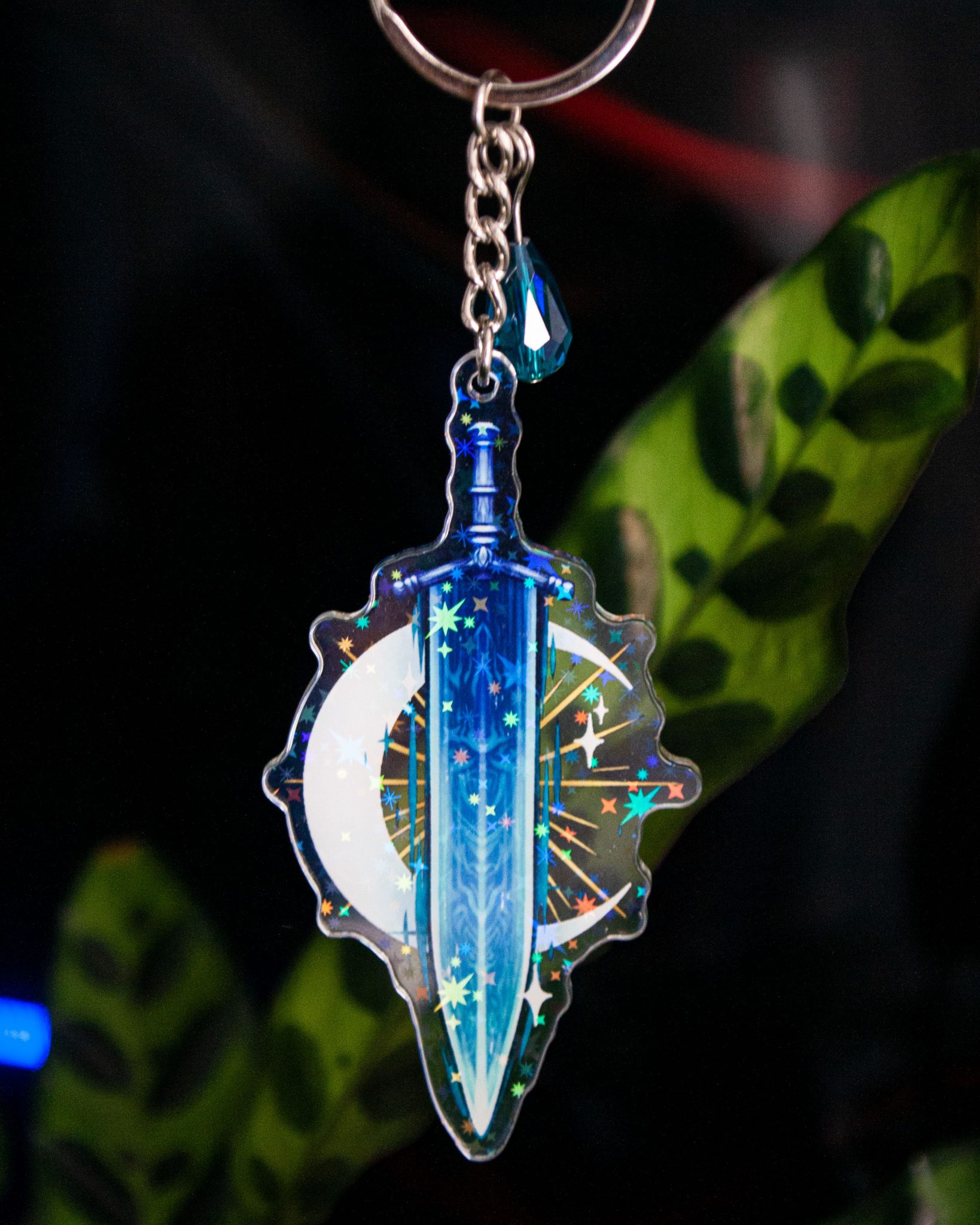 Holographic keychain inspired by Soulsborne saga. The acrylic part size is 9cm x 4,5cm approximately. Its material is acrylic with a metallic clasp.